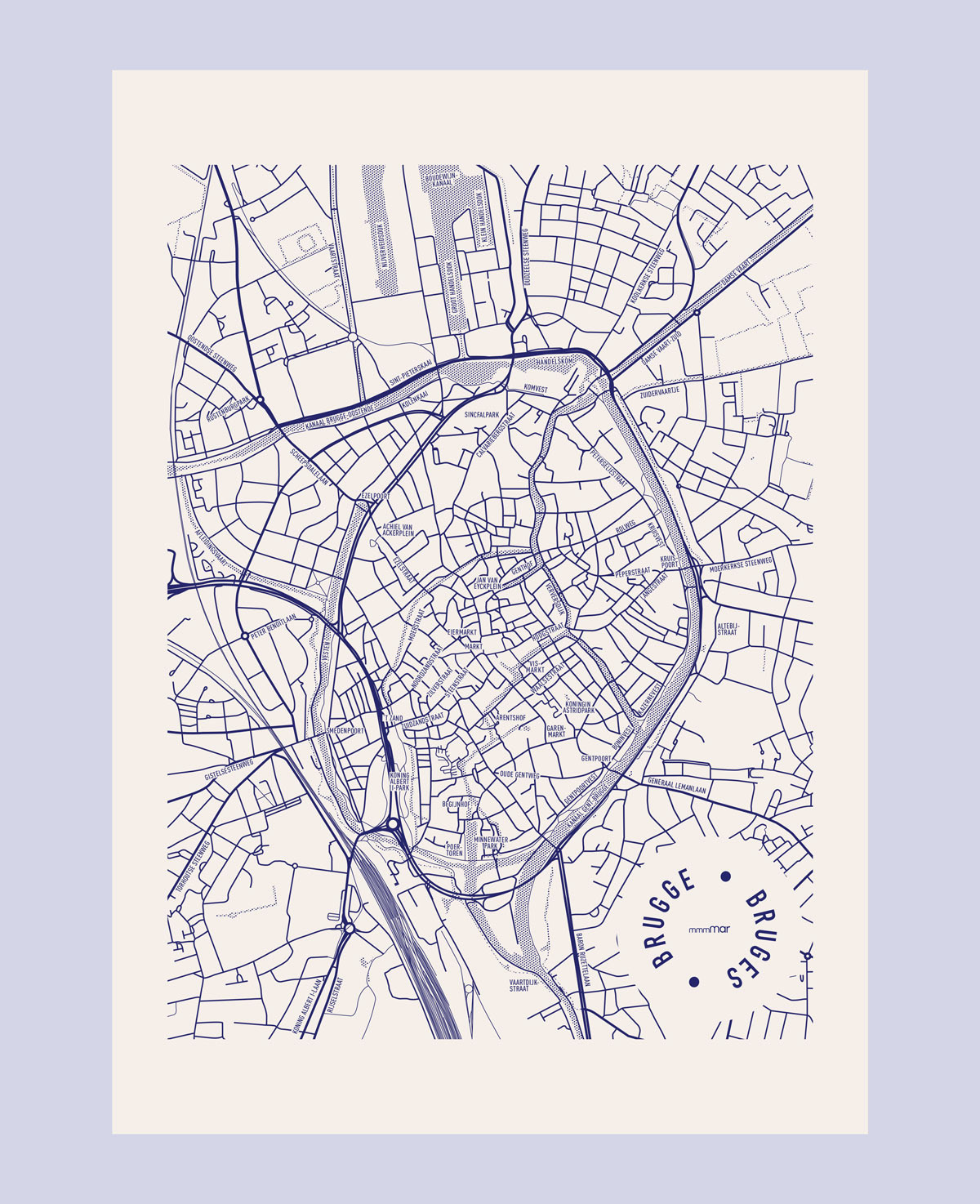Postkaartjes Brugge. De kaartjes zijn met de hand gezeefdrukt op vanillekleurig ongestreken papier van 350 gr.