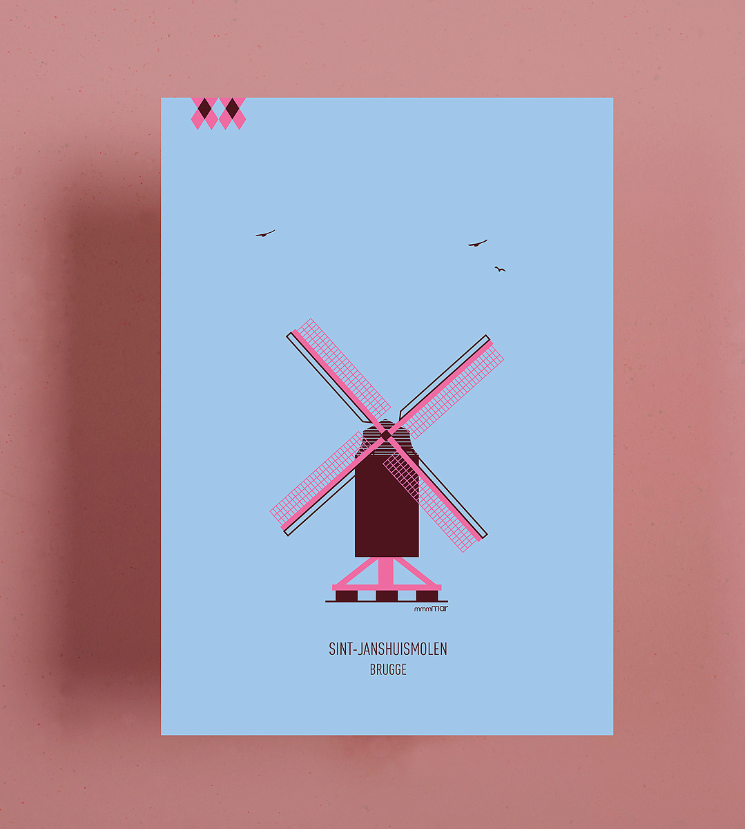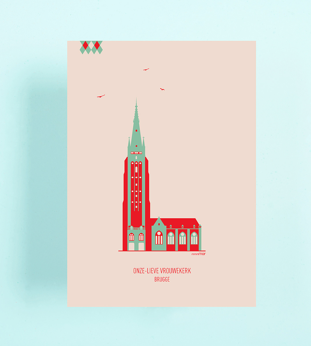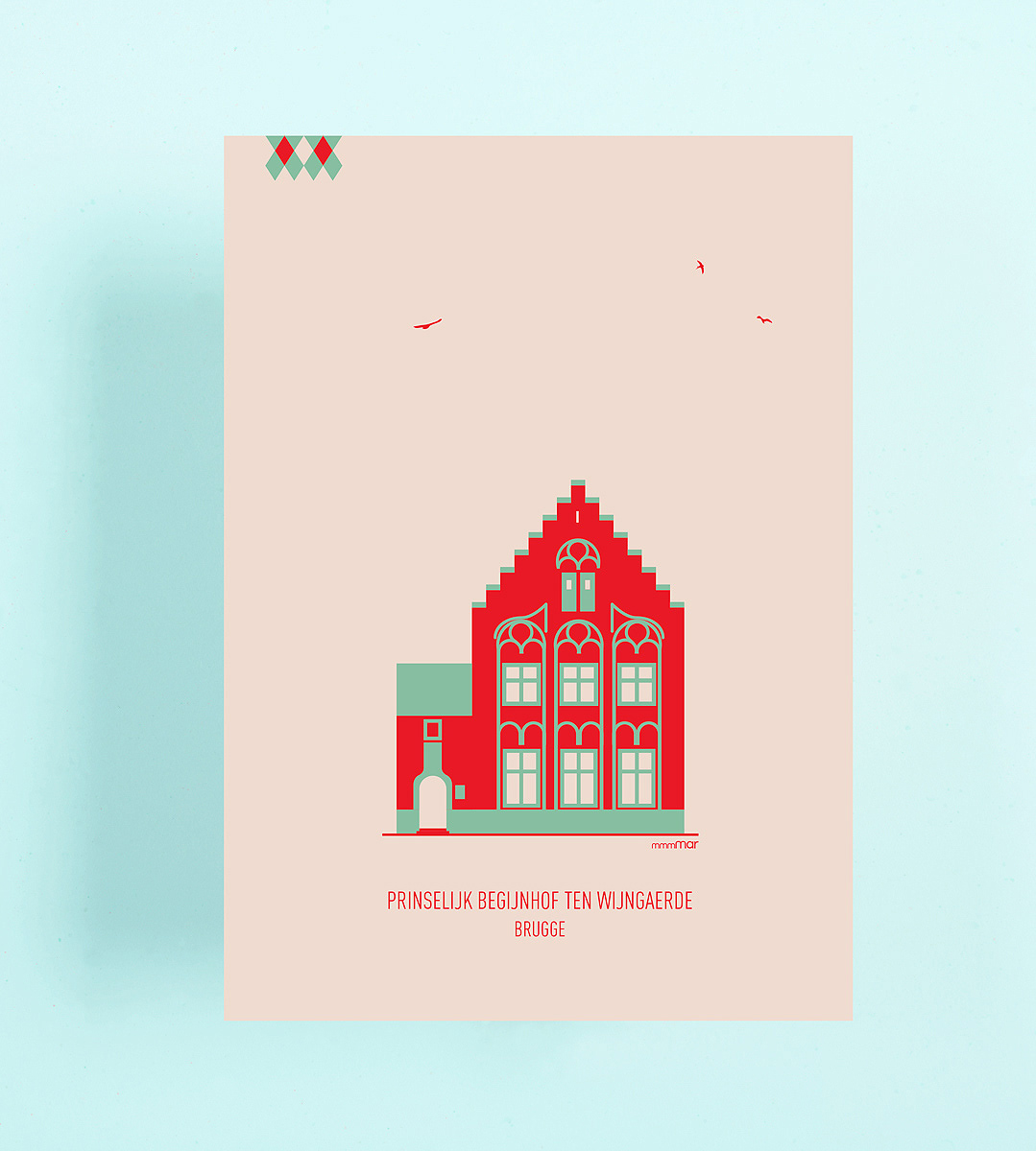 A3 poster met Brugse gebouwen. De posters zijn met de hand gezeefdrukt op lichtgrijs ongestreken papier van 170 gr.
