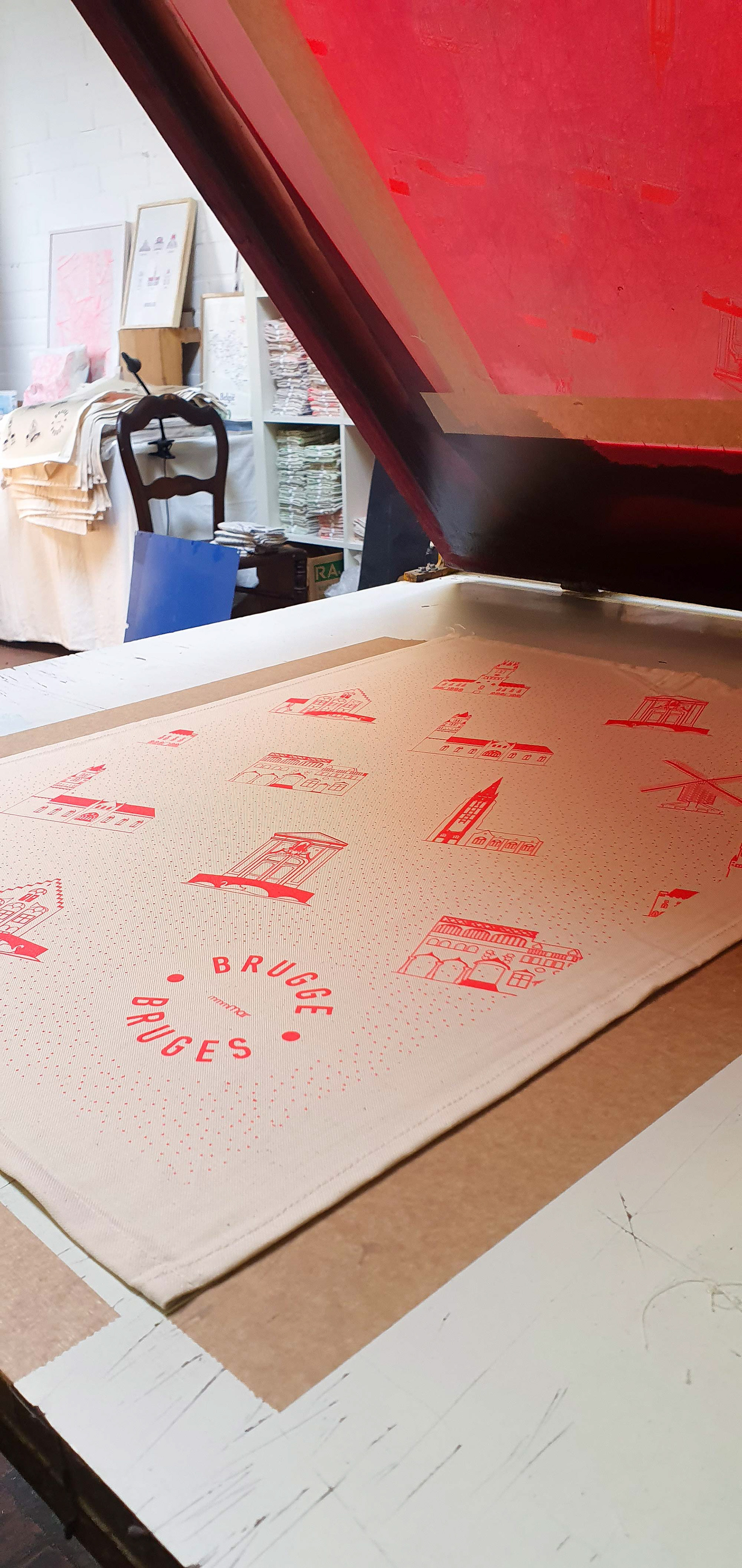 Theedoek gebouwen Brugge. De theedoeken zijn verkrijgbaar met blauw of fluo rode print en zijn gedrukt op een doek van 100% gecertificeerd biologisch katoen. We drukken steeds met natuurvriendelijke inkten op waterbasis.