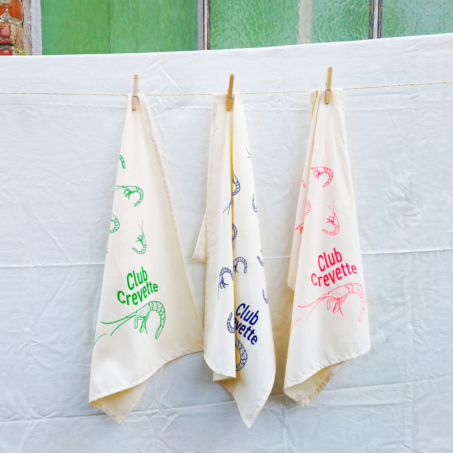 Theedoek Club Crevette, deze handgezeefdrukte theedoeken zijn een must-have voor iedere keuken. Gemaakt van 100% organisch katoen en met zorg bedrukt in ons zeefdrukatelier in het Gentse. De theedoek is beschikbaar in blauw, fluo rood of groen.